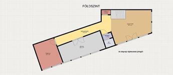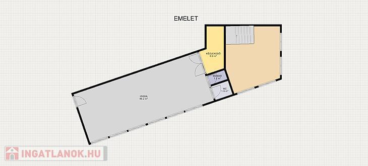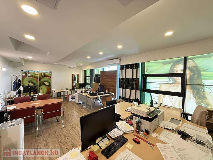A magasföldszinten beérkezve egy üzlettér található konyhával és egy lépcsőház. Az emeleten, iroda fürdőszoba mellékhelyiséggel., A földszinten pedig 1 irodahelyiség 1 tároló és egy fürdőszoba.