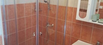 1. Apartman - 45 m2: Az egyik emeleti teraszos apartman folyosóval, konyha-étkezővel, 2 hálószobával, zuhanyzós fürdőszoba-Wc-vel és terasszal rendelkezik.