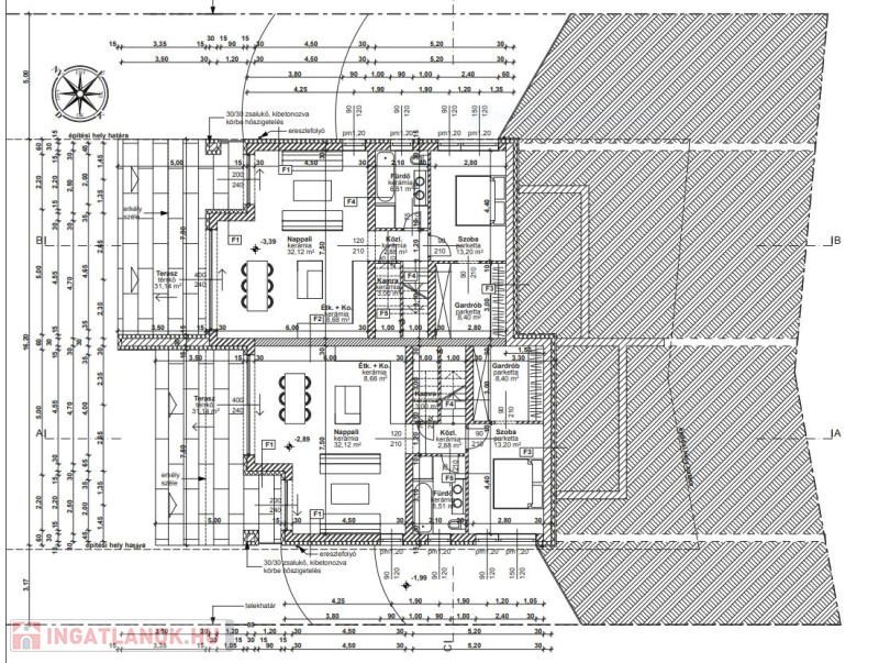 Földszint: nappali 32,12 m2, konyha-étkező 8,68 m2, közlekedő 2,88 m2, kamra 3,00 m2, fürdő 6,51 m2, gardrób 8,40 m2, szoba 13,20 m2 és egy 31,14 m2-es terasz
