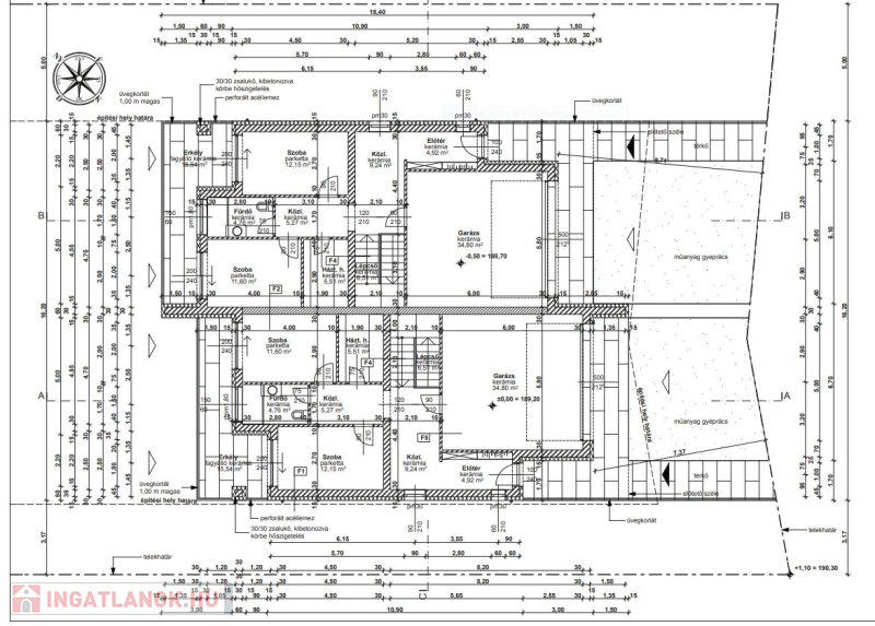 Emelet: garázs 34,80 m2, előtér 4,92 m2, közlekedő 9,24 m2, lépcső 6,51 m2, közlekedő 5,27 m2, fürdő 4,76 m2, szoba 12,15 m2, szoba 11,60 m2, háztartási helyiség 2,03 m2 és egy 15,54 m2-es erkély