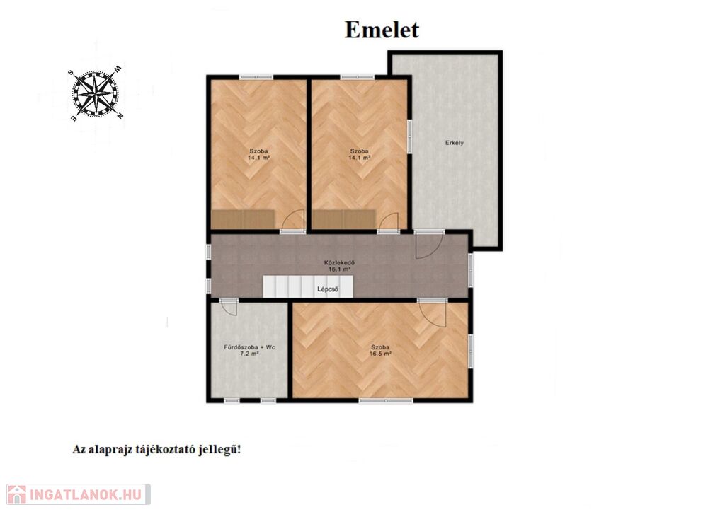 Burkolatok: szobákban parketta, egyéb helyiségekben járólap