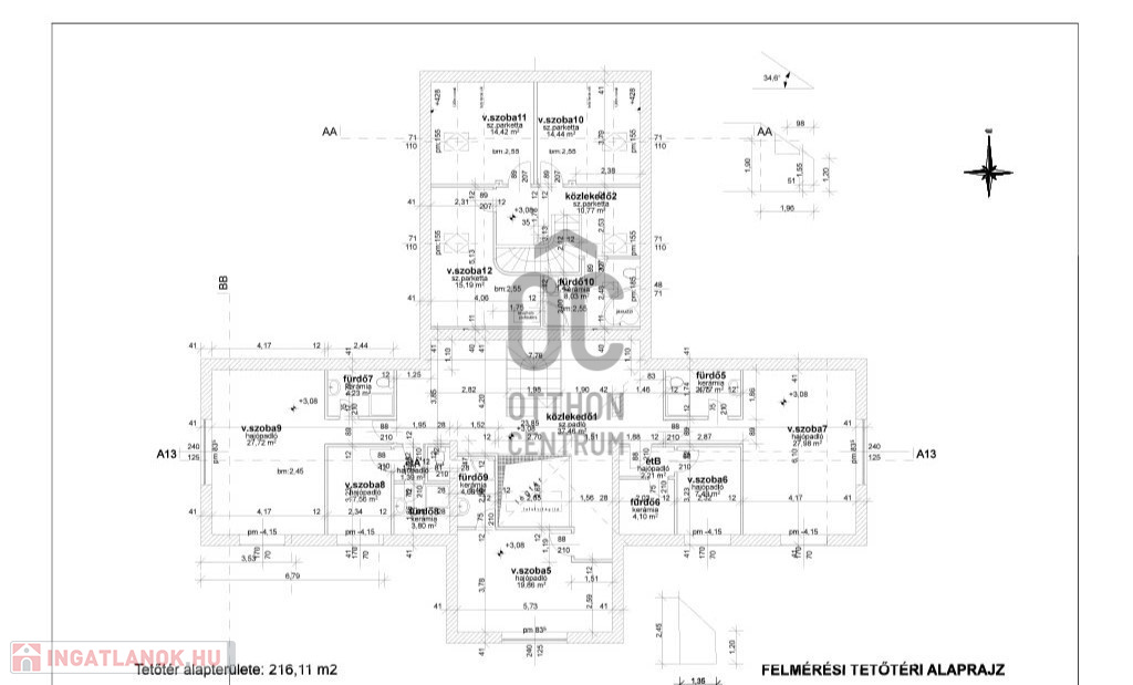 16 m2-es fedett teraszon keresztül jutunk be a 32,9 m2-es nappaliba, földszinten még 4 szoba, közlekedő, 4 fürdőszoba-WC, konyha, valamint a külön lakrészben nappali-étkezővel, terasz, közlekedő, gardrób, zuhanyzó-WC helyiségek kerültek kialakításra.