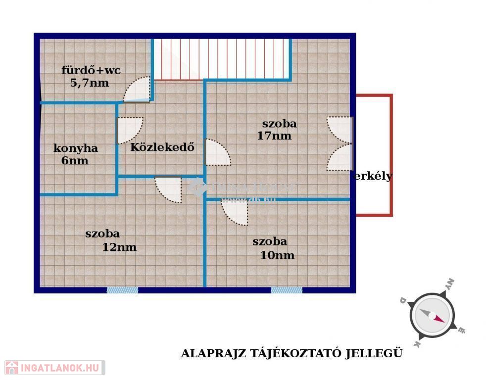 Az emeleti részen pedig egy tágas 17 nm-es erkélyes szoba, melyet akár nappalinak vagy szülői hálónak is ki lehet alakítani, valamint két további szoba, egyenként 10 és 12 nm-esek. Itt található még egy fürdőszoba és egy konyhafülke is.