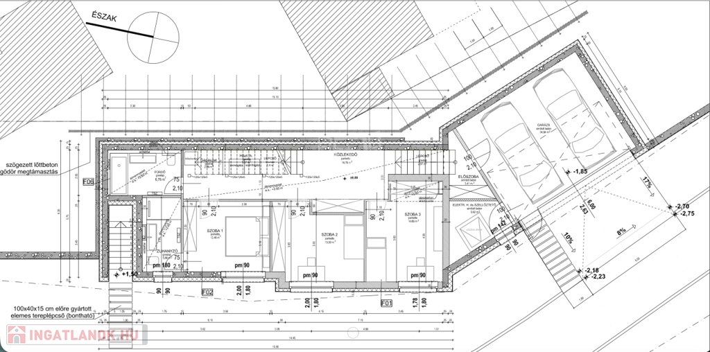 - Alapozás: 30 cm monolit vasbeton lemez + sávalap