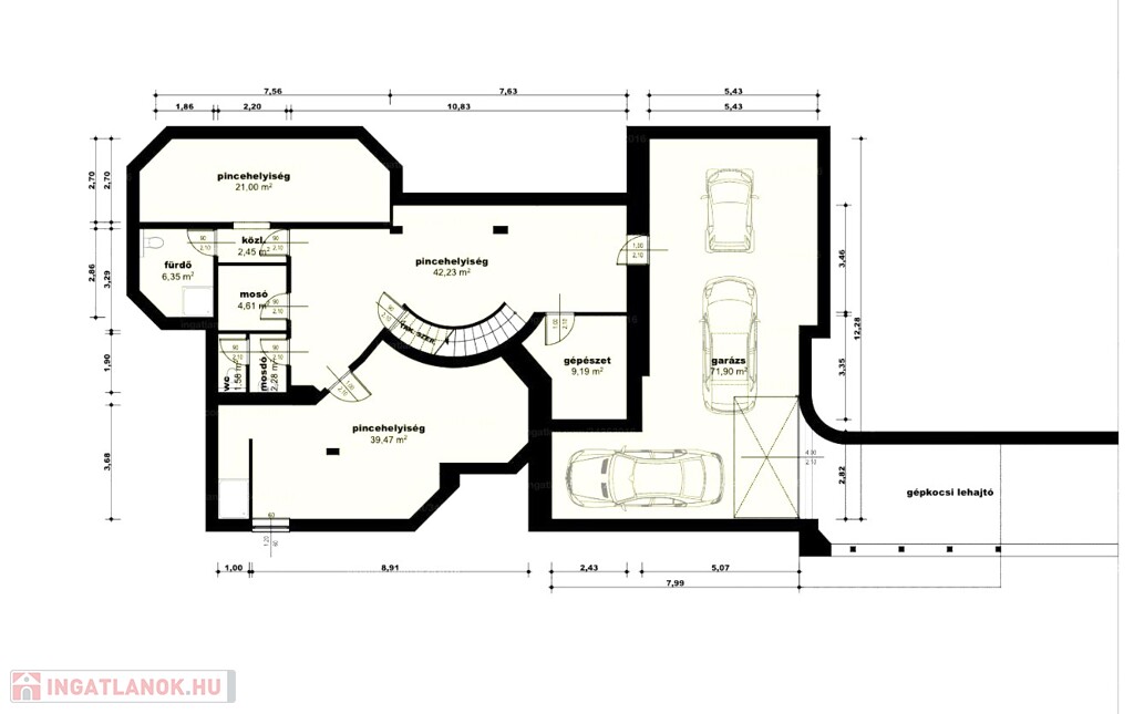 pinceszint: 2-3 autó részére garázs, hatalmas tárolók, konditerem, fürdőszoba, mosdó, gépészeti helyiség (gáz cirkó)