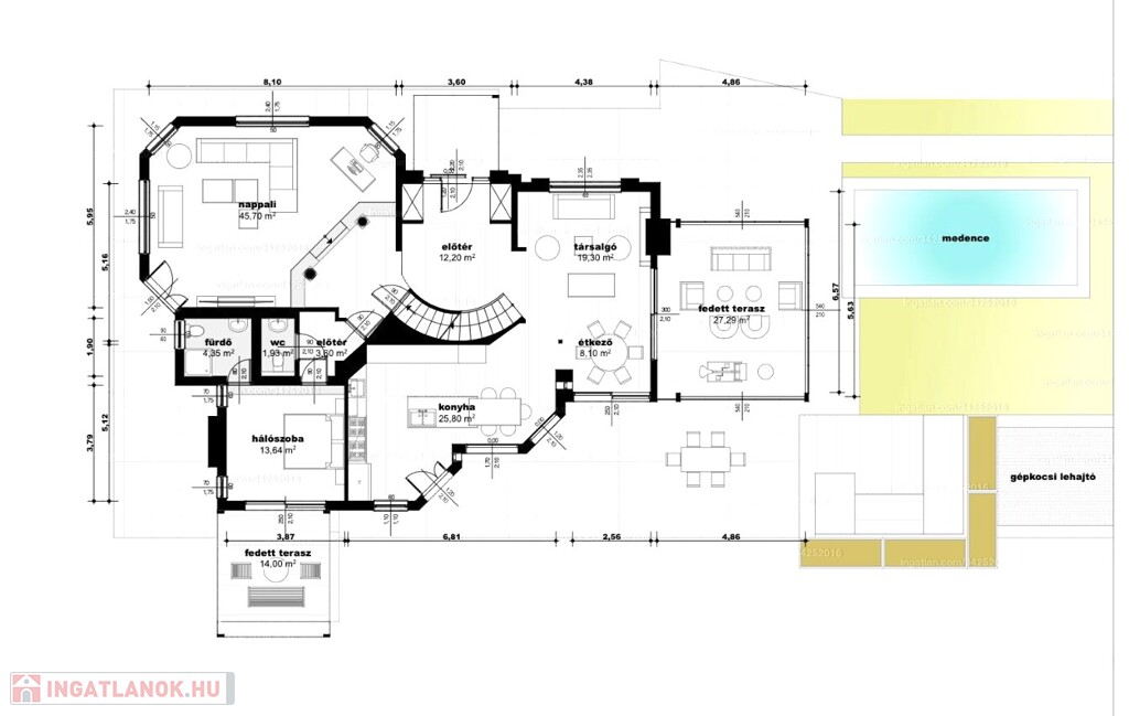 földszint: hatalmas nappali, 1 hálószoba fedett terasszal, fürdőszoba, vendég wc, beépített, gépesített konyha, étkező, társalgó kandallóval, üvegezett terasszal, fűthető medence és napozóterasz, gondozott kert