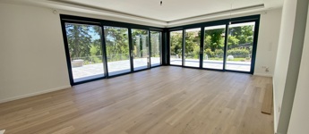 The 75 m² living room, dining area and kitchen create an elegant open space with direct access to the 105 m² partly covered panoramic terrace.