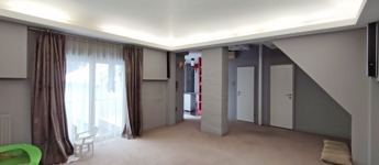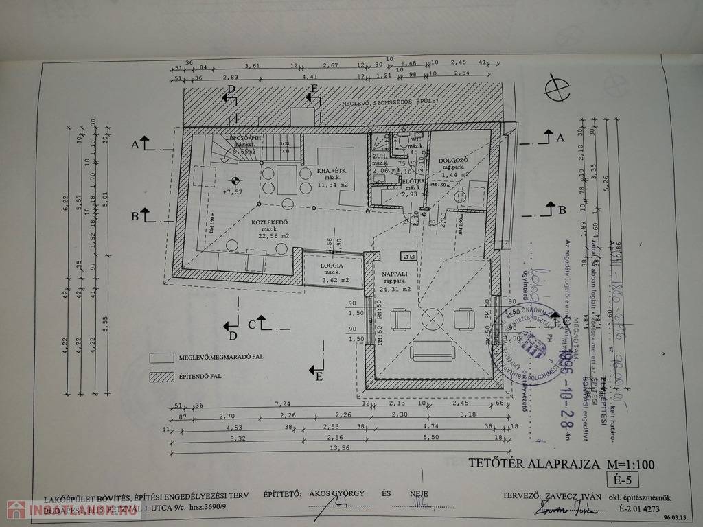 Innen kilépve a zárt lépcsőn felfelé haladva a tetőtérben kapott helyet a 34 nm-es gépesített, elektromos főzőlapos, modern bútorozott, amerikai konyhás, klímás nappali, a konyhai résznél járólappal burkolt, ezen kívül itt is padlószőnyeg szolgálja a komfort érzetet, innen nyílik a 3,6 nm-es loggia ahol napozni, kávézni lehet reggelente, plusz még ebben a légtérben, egy 24,30 nm-es társalgó-nappali szoba került kialakításra, amiből egy 2,7 nm-es dolgozószoba nyílik, mellette pedig a zuhanyzós fürdőszoba található, a külön nyíló toalettel. Itt is kapott helyet egy 2,9 nm-es tároló amiben a mindennapi főzéshez szükséges dolgokat lehet tárolni.