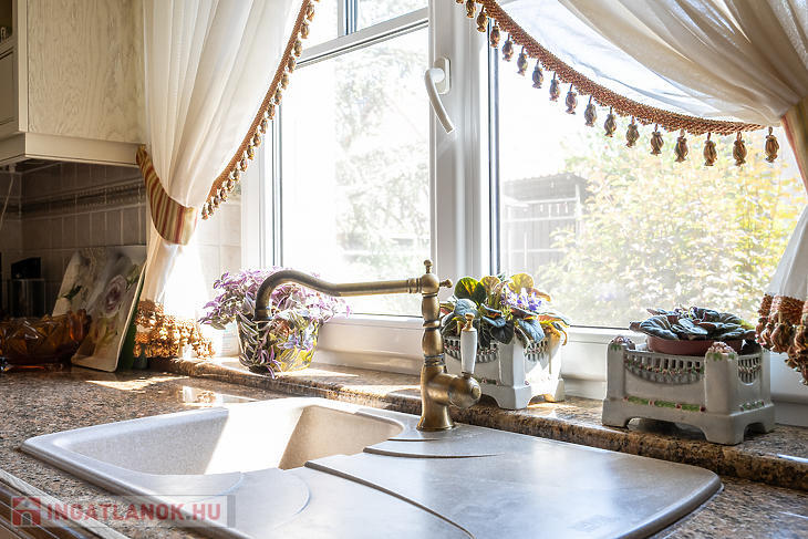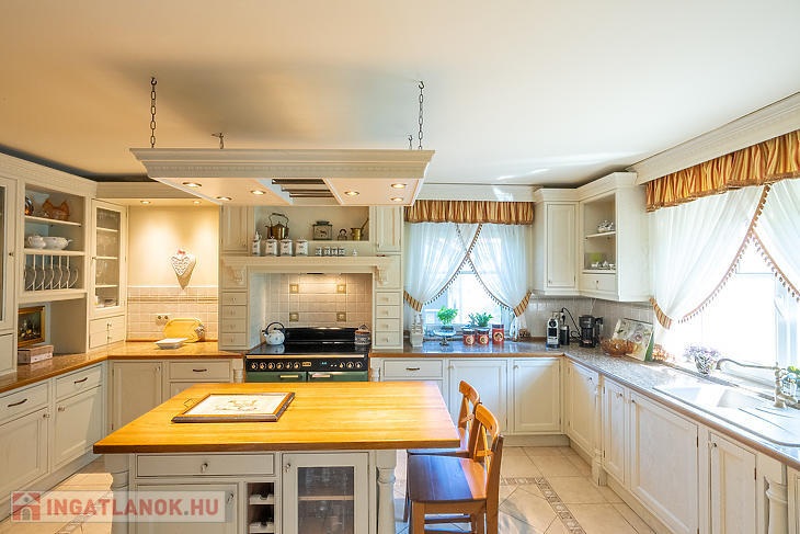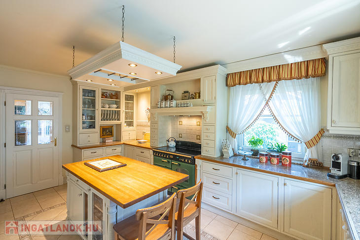 A konyha kialakításánál, az angol konyhastílus volt a meghatározó. A konyhabútor, tömörfából, méretre készült. A tűzhellyel együtt a vételár részét képezi. Ugyanakkor a házban található beépített bútorok is egyedileg, tömörfából készültek és szintén a vételár részét képezik.