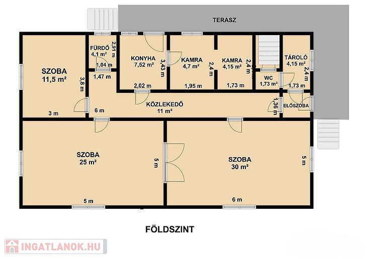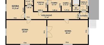 Elrendezés: 3 szoba, konyha, kamra, kádas + zuhanyzós fürdőszoba wc-vel, előszoba, közlekedő, tároló, terasz.
