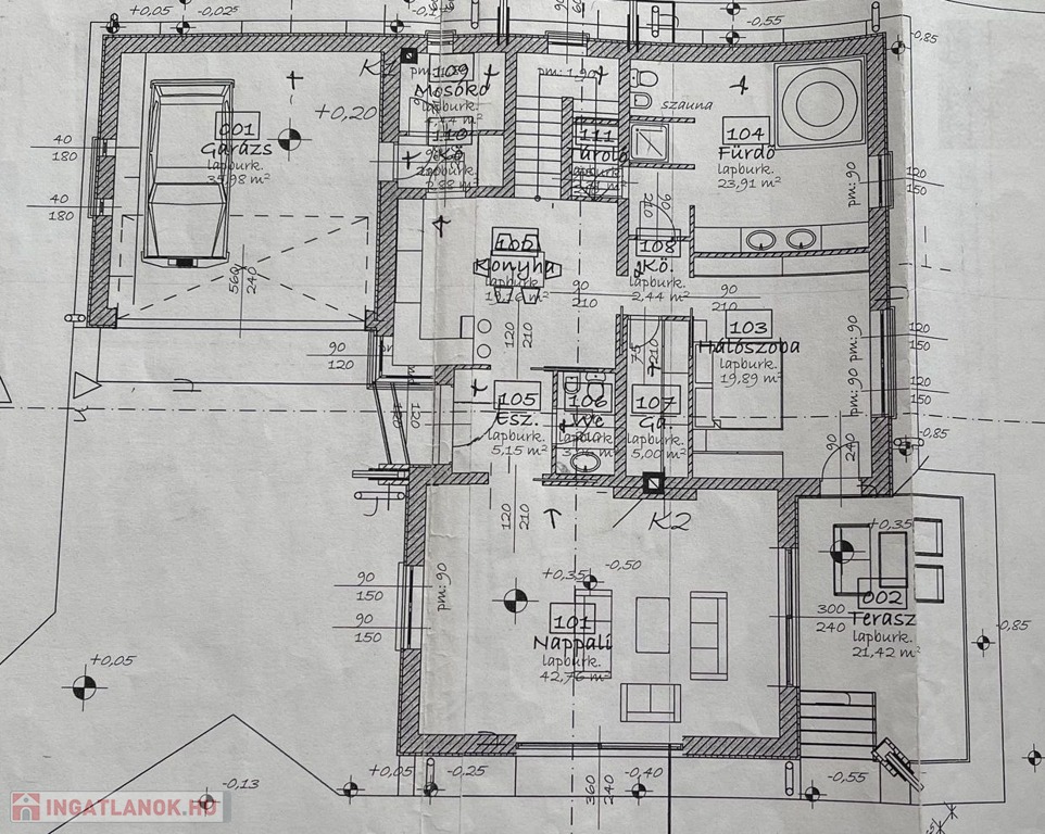 Balra a kétállásos garázs található, mellette pedig az elegáns, savmart díszítésű biztonsági bejárati ajtón keresztül érkezünk a házba. Először a tágas előszobába lépünk, ahonnan szemben a a földszinti mellékhelyiséget, jobbra az igényes, napfényes, kandallós, 43 nm-es, teraszkapcsolatos nappalit, balra pedig a 19 nm-es, étkezős konyhát találjuk. A konyha magasfényű konyhabútorával, egészében csúcsminőségű Siemens gépesítésével minden igényt kielégít. A konyhából balra előre nyílik a mosókonyha, jobbra pedig a 20 nm-es, tágas földszinti hálószoba. A hálószobához kapcsolódik egy 5 nm-es gardróbszoba, ugyaninnen nyílik a 24 nm-es, jakuzzis masszázskáddal, WC-vel és zuhanyzóval is ellátott földszinti fürdőszoba. A nappaliból és a hálószobából is megközelíthető a 21 nm-es, üvegtáblákkal teljesen zárt, redőnnyel felszerelt terasz, amelyből igény esetén teljes értékű szabad terasz nyitható az üvegtáblák eltolásával.