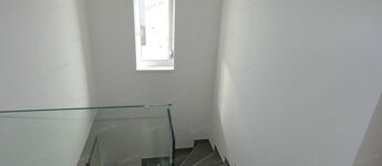 Belső térben, a lépcső mellett modern üvegkorlát világítással.