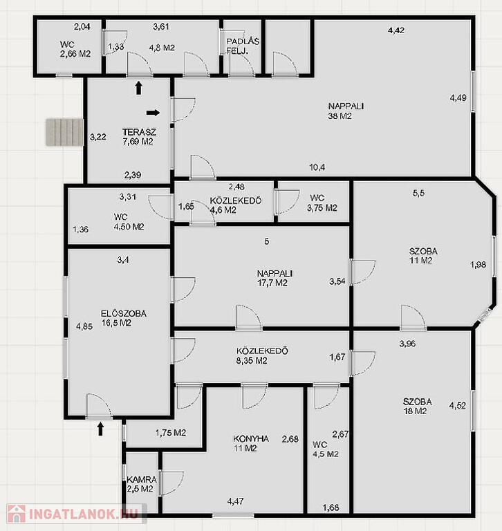 Mivel 2 bejárattal rendelkezik, igény esetén akár 2 generációssá is alakítható. Tágas nappali, 3 szoba, konyha, 2 fürdőszoba, több mellékhelyiség, közlekedő, kamra áll rendelkezésre.