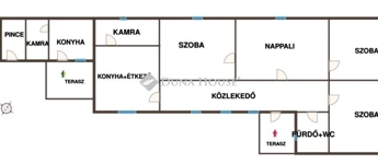 Kialakítása : 3 tágas külön nyíló szoba, nappali, közlekedő, fürdő+wc, konyha+étkező, kamra. További nyári konyha, kamra, tároló és pince a fő épület után.