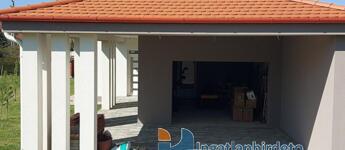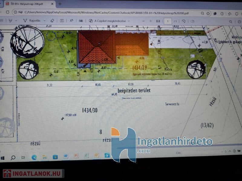 A képeken a két telek egybe van bekerítve, így a mérete 2341 m2, 40x54 méteres saroktelek. A terület fásítva, babérmeggyel a kerítés vonalában beültetve, és egy kerti tárolóval lett kialakítva. Ha most vásárolja meg az ingatlant, még kitudja választani a burkolatokat, a konyhaszekrényt, és a fürdőszobai szanitereket. Beköltözés várható ideje, szerződéskötéstől számított kb. 3 hónap, ami a választott anyagok beérkezésétől is függ.