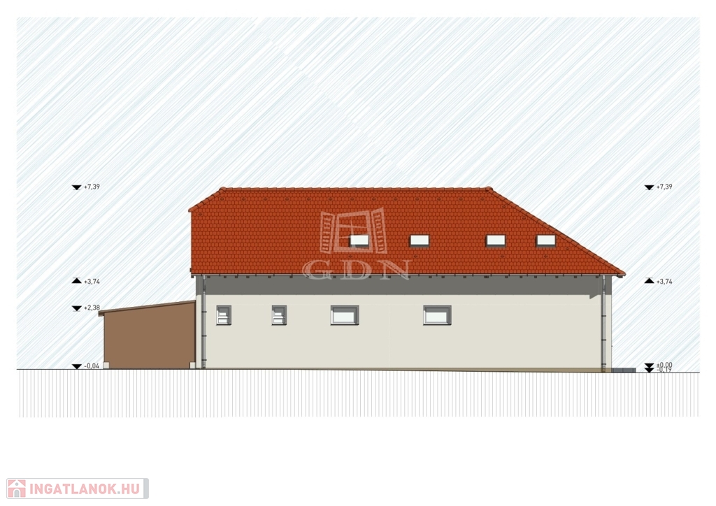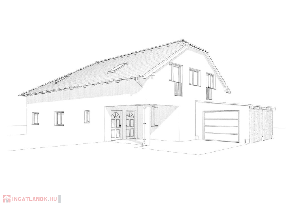 A ház egy 713 m²-es, rendezett, sík telken helyezkedik el, garázzsal és kb. 10 m²-es földes pincével.