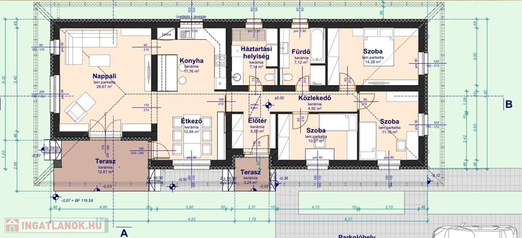 3 hálószobával, + nappalival, étkezővel és konyhával. Hőszivattyús rendszer, hűtő-fűtő klíma, 15 cm-es szigetelés.