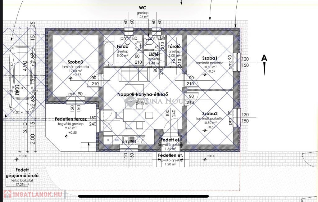 Fűtött alapterület: 66.79 m2 fedett gépkocsitároló: 17,10 m2 nyitott terasz:9.43 nm