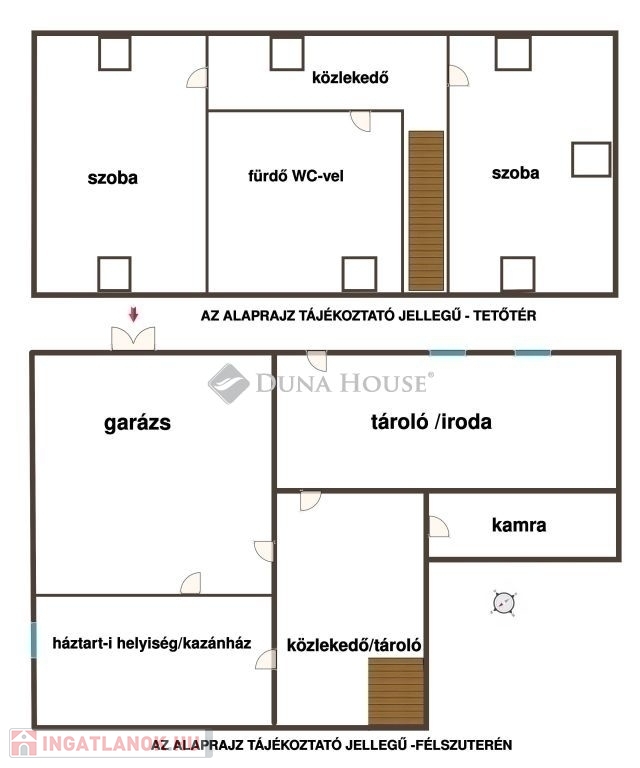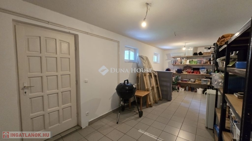 A félszuterén szinten a kiszolgáló helyiségek vannak, tárolók, kamra és egy háztartási helyiség, mely egyben kazánház is, ill. a közel 35 nm-es garázs. Az egyik tároló külön közvetlen kijárattal rendelkezik a kert felé, ezért akár önálló lakrészként, irodaként is funkcionálhat.