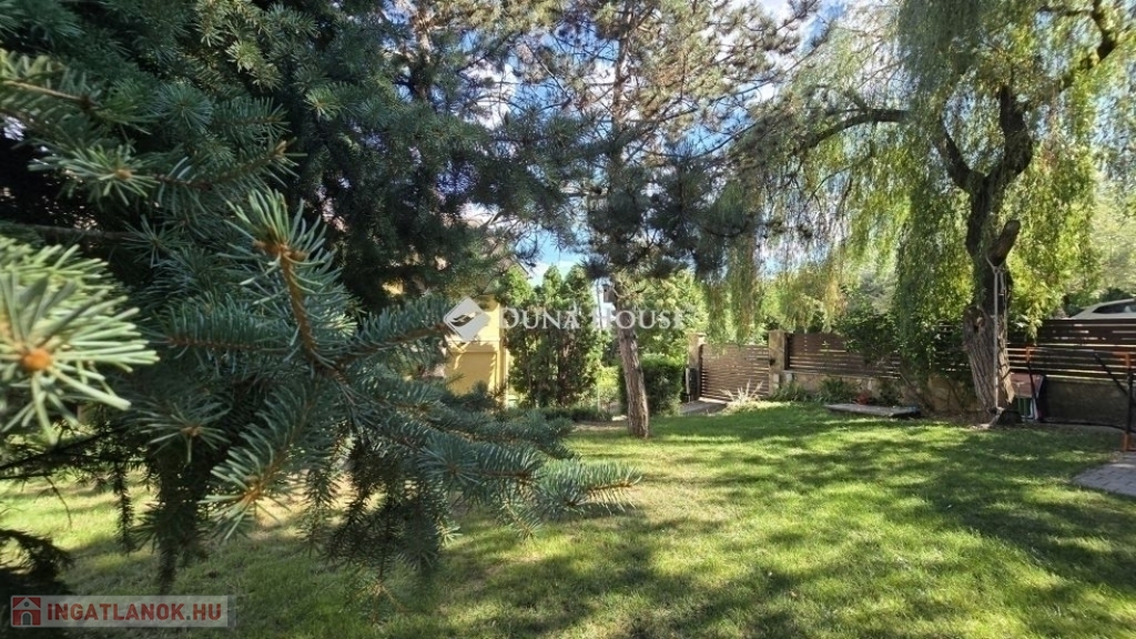 A 617 nm-es kert ÉK-DNY tájolású, enyhén lejtős, szépen parkosított örökzöld növényekkel és egy terebélyes fűzfával.