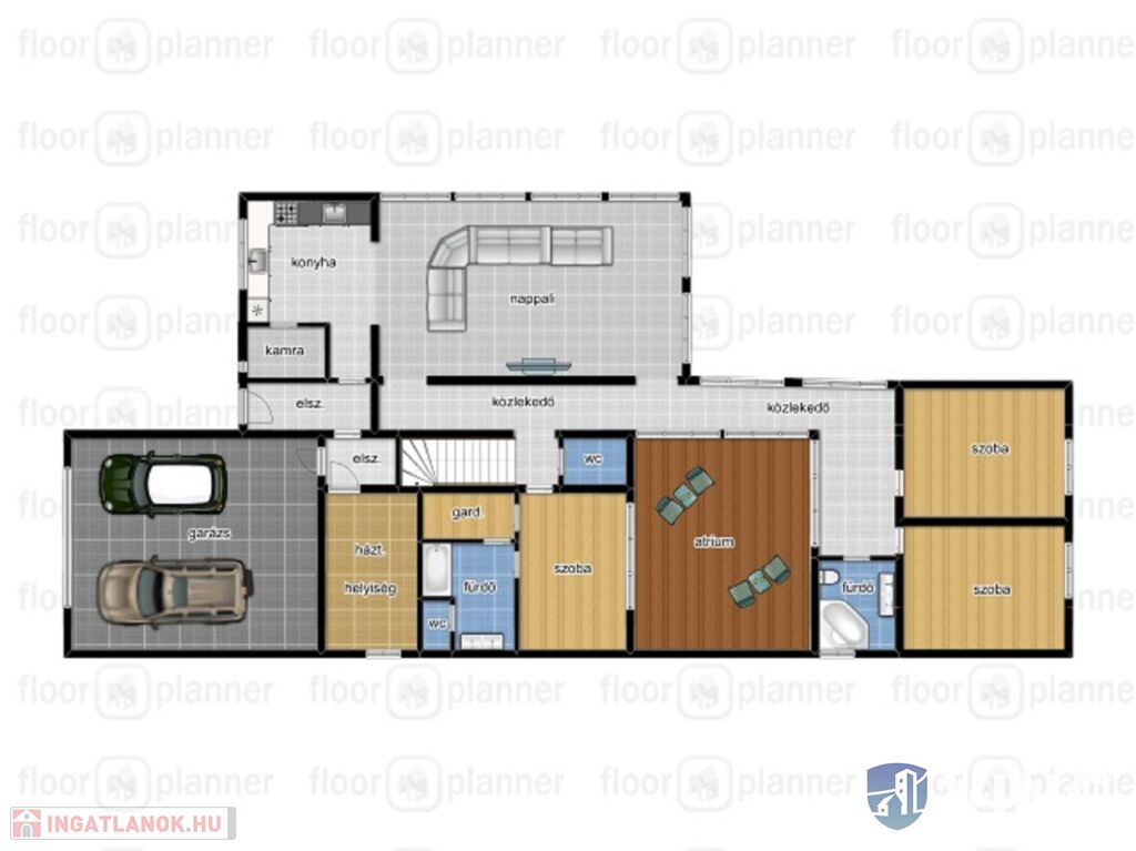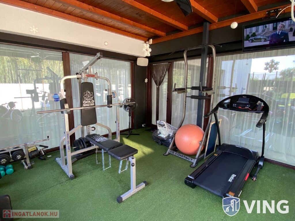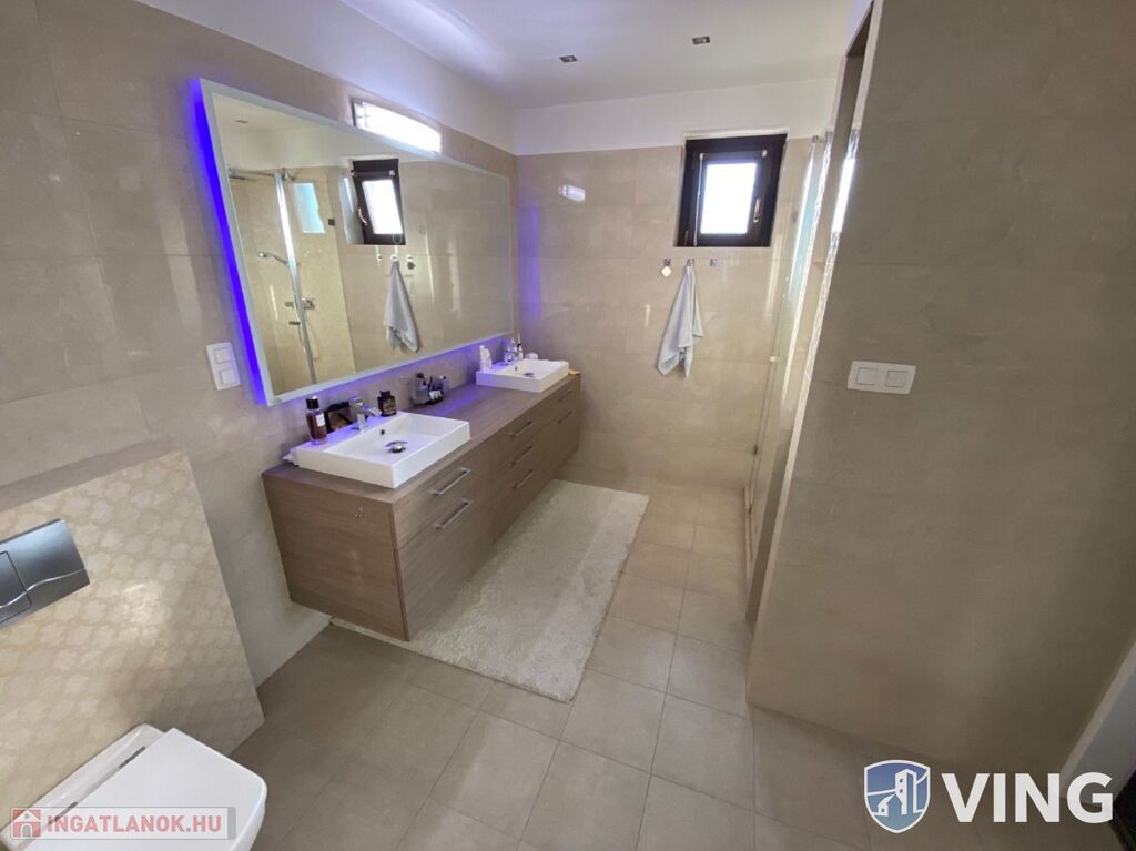- Dupla garázs, padlófűtéssel, elektromos garázskapuval, udvarban kocsi beálló, elektromosan nyitható lengő nagykapukkal.