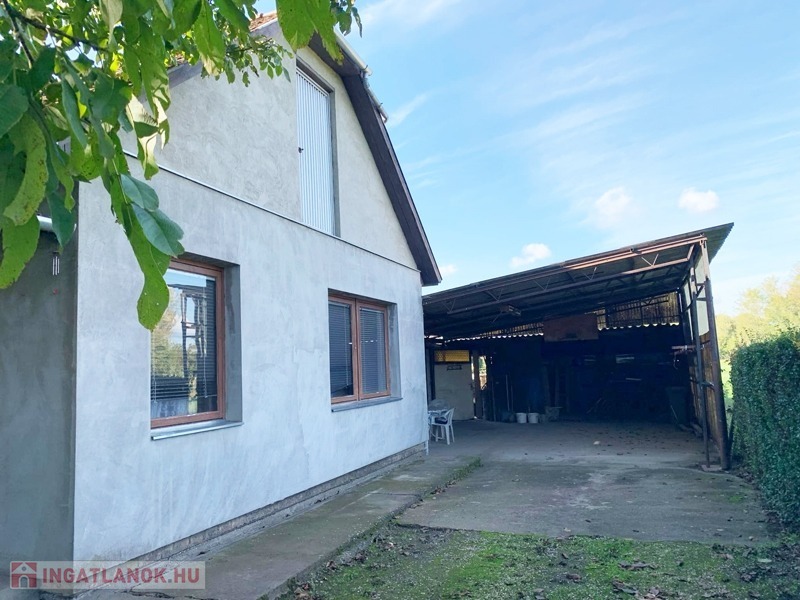 A kocsibejáró betonozott. A garázsok előtt hatalmas féltető, aminek hátsó fala fa tárolásra alkalmas. Emögött van a konyhakert.