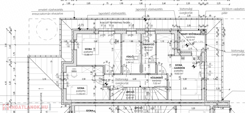 • Tető: monolit födém, lapostetős kialakítás, antracit színű fémlemez fedéssel