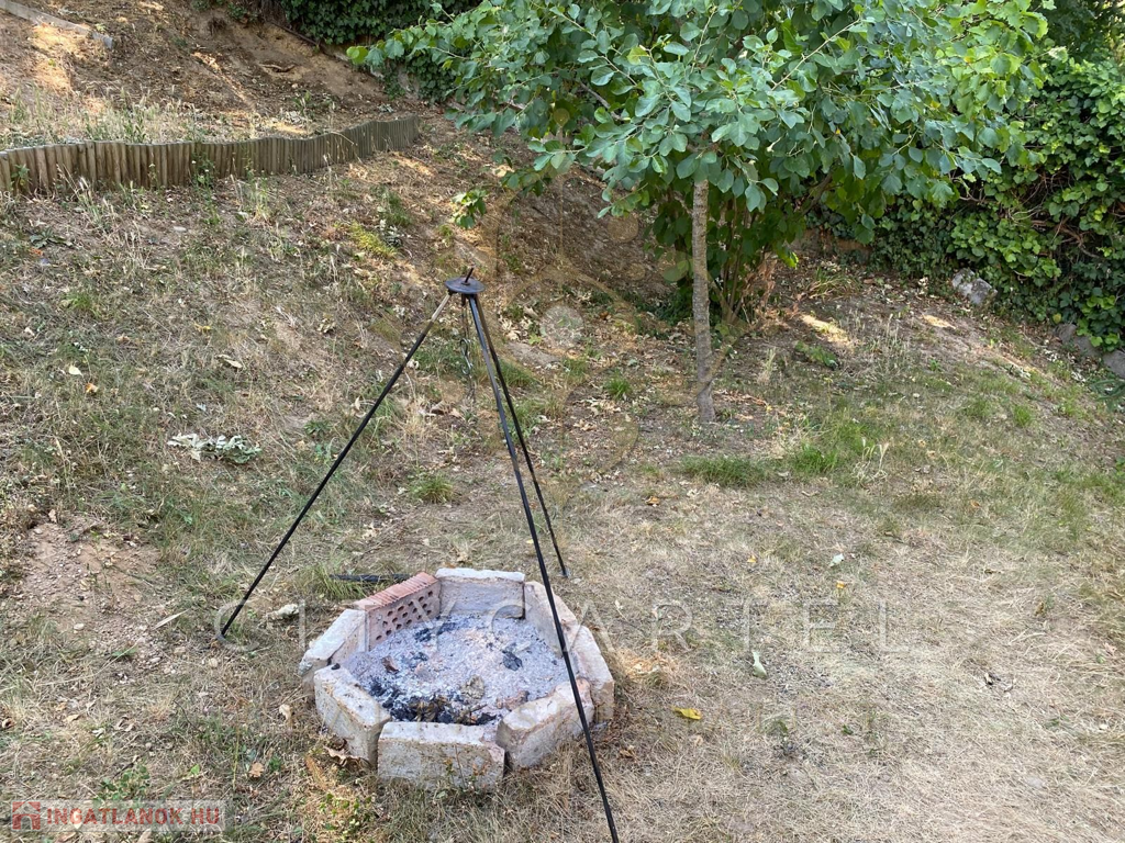 A következő szinten egy bográcsozóhely lett kialakítva, ahol a közös főzések emlékezetes pillanatokat ígérnek. A felső teraszrész elegendő helyet biztosít akár egy vásárolt, mobilmedence elhelyezésére is, így a nyári felfrissülés is garantált.