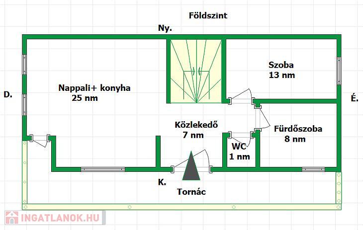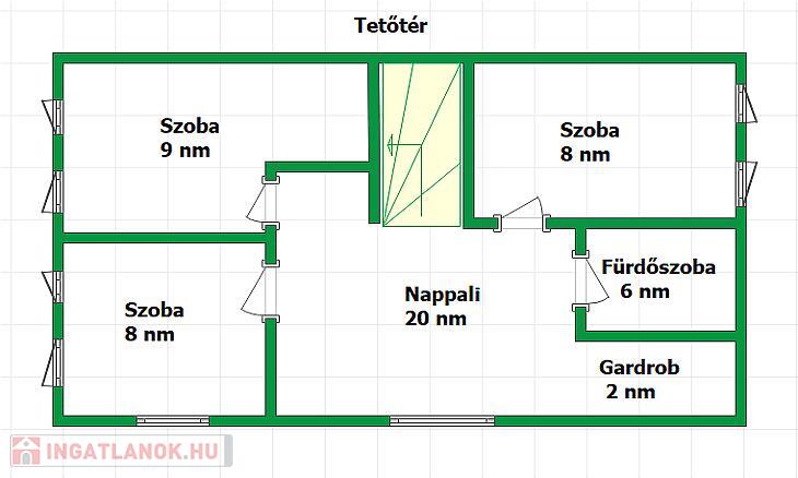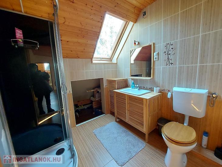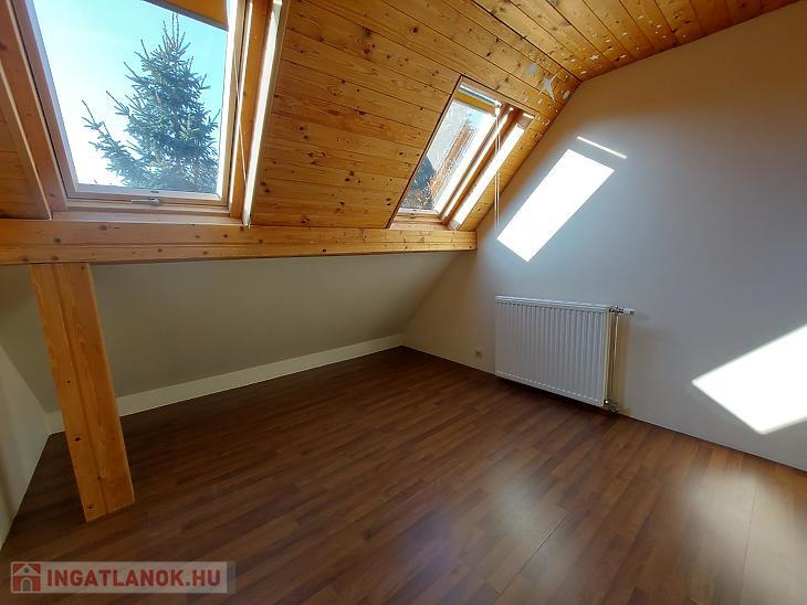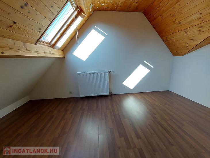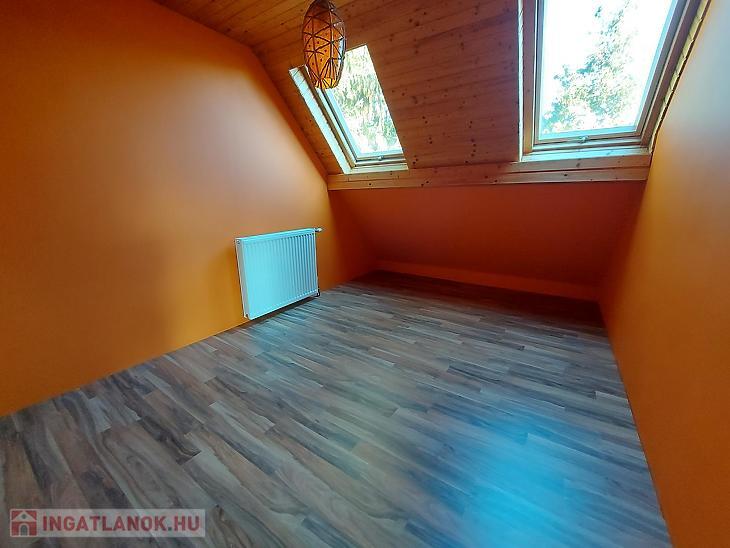 Elosztása: földszinten van egy amerikai konyhás nappali, 1 db hálószoba, előszoba, fürdőszoba, WC, továbbá a tetőtérben van egy nappali, 3 db hálószoba, fürdőszoba, gardrób.