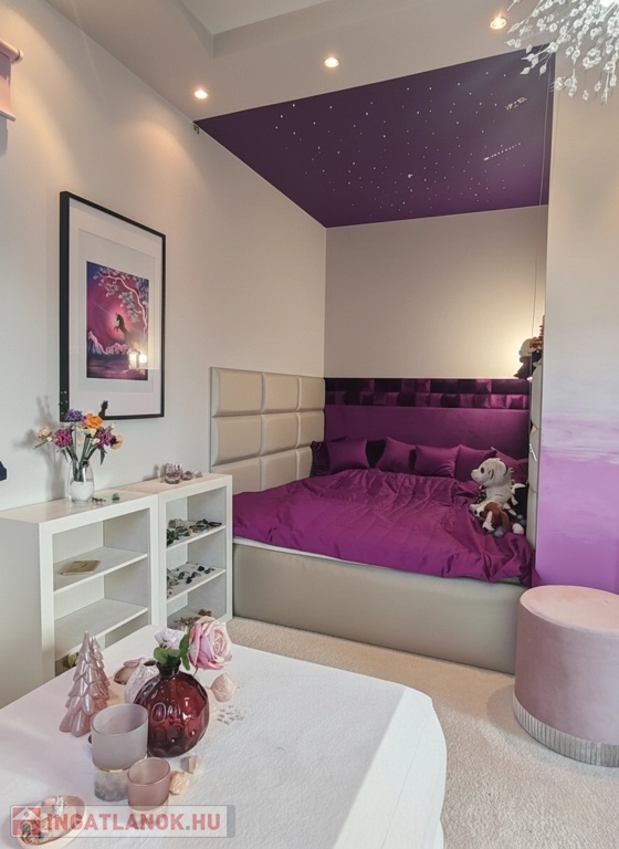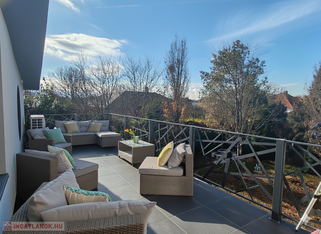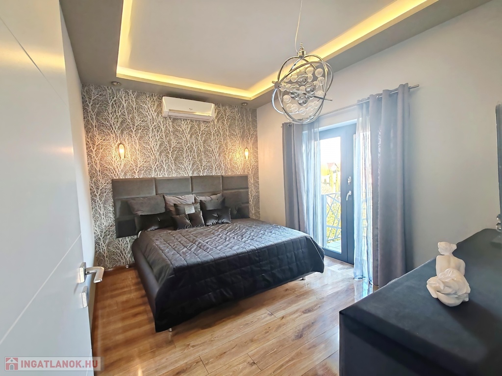 Az ingatlan egy dupla állásos fűtött garázst, tágas előszobát, 4 nagy méretű hálószobát, 2 luxus fürdőszobát, jól felszerelt konyhát, hangulatos étkezőt és egy galériás elegáns, világos nappalit rejt magában. A családiházat a kertkapcsolatos terasz és a hálószoba kapcsolatos erkélyek teszik teljessé.