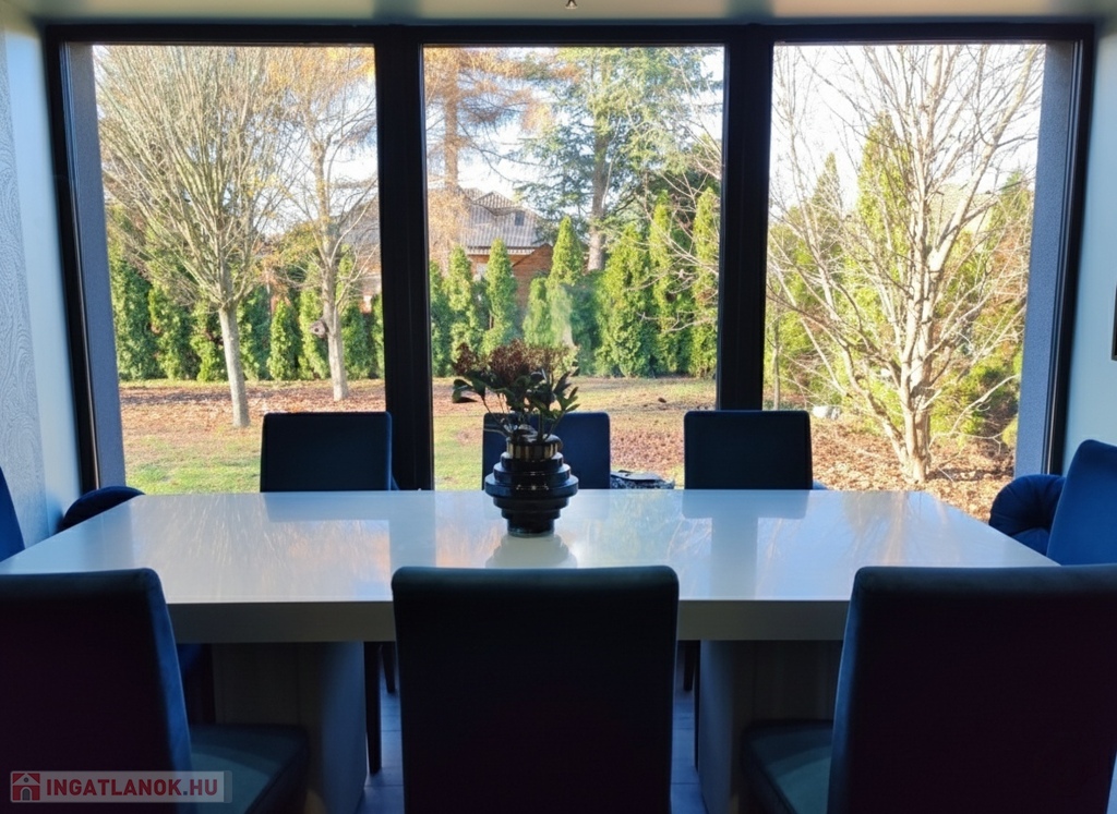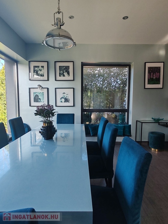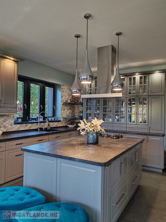 Az amerikai stílusú konyha a hatalmas konyhaiszigettel, beépített gépeivel, ipari szagelszívóval felszerelve páratlan élményt nyújt a főzésben. A konyha folytatásában elhelyezkedő étkezőből csodás kilátás tárul az egész kertre.
