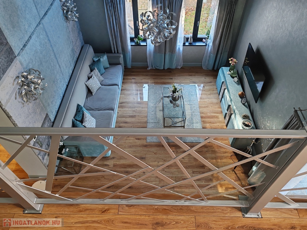 A ház fő éke a földszint izgalmas nappali-társalgó helysége, mely impozáns 6 métert meghaladó belmagasságával, kárpitozott falpanellel borított falával, a tökéletes komforthoz gyártott egyedi design bútoraival, és palakővel burkolt kandallójával magas fokon ad teret minden összejövetelnek.