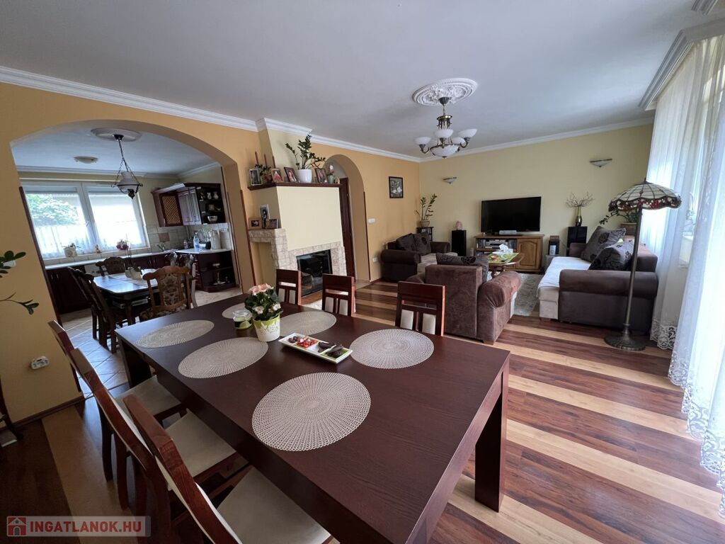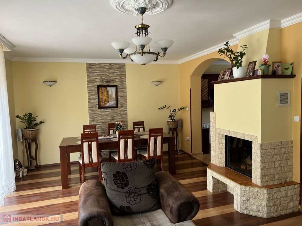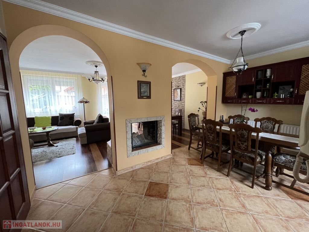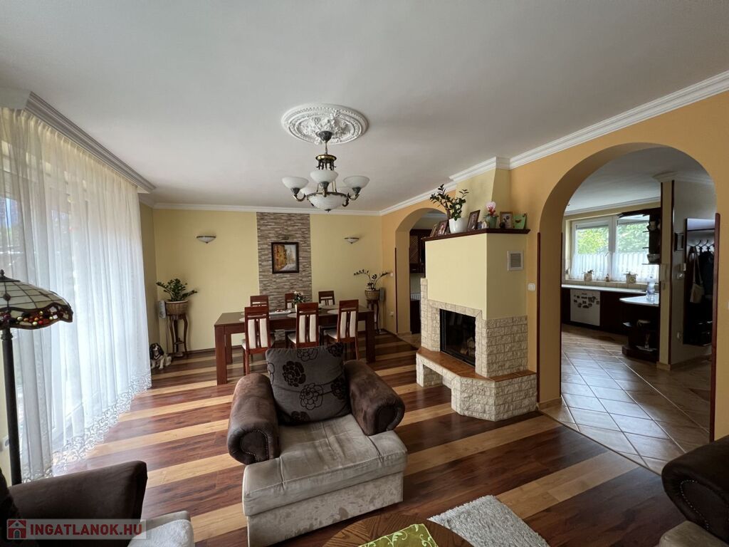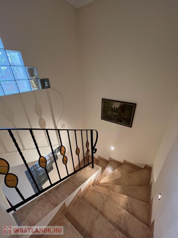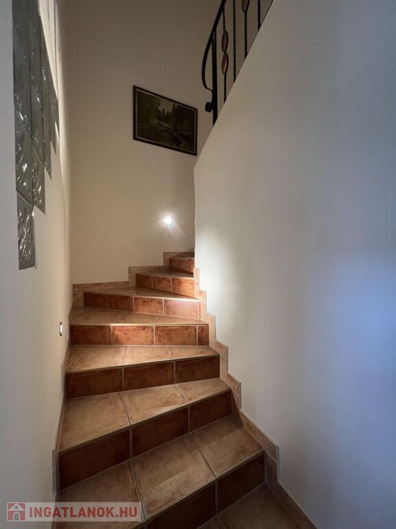 Az alsó szinten előszoba, mosókonyha-wc, kamra, 18 m2-es konyha-étkező és egy 31 m2-es kétoldalas fatüzelésű kandallóval beépített nappali található, mely 15 m2-es, teljes egészében elektromos napellenzővel felszerelt terasz és 40 m2-es körbekerített kertkapcsolatával biztosítja a sorházi lakás kényelmét.
