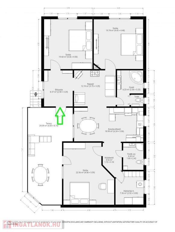 Az ingatlan nappali–étkező–konyha + 3 szobás kialakítású, emellett két fürdőszobával rendelkezik, így ideális választás akár családok számára is.