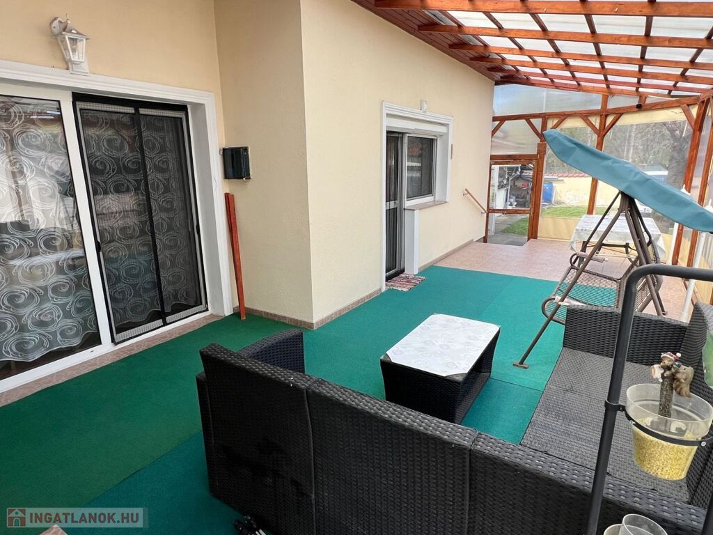 A házhoz tartozik egy 29 m²-es terasz, 18 m²-es garázs, 15 m²-es könnyűszerkezetes gépkocsibeálló, valamint egy 31 m²-es tároló.