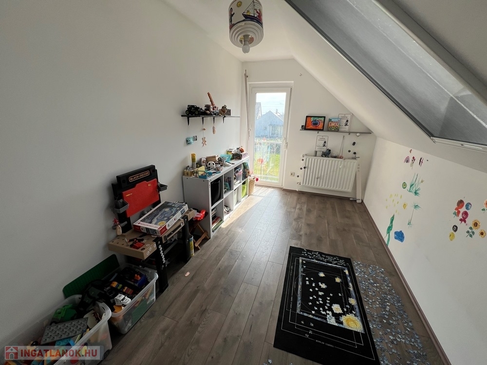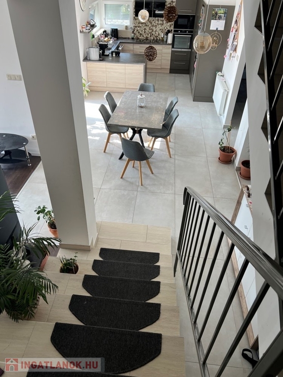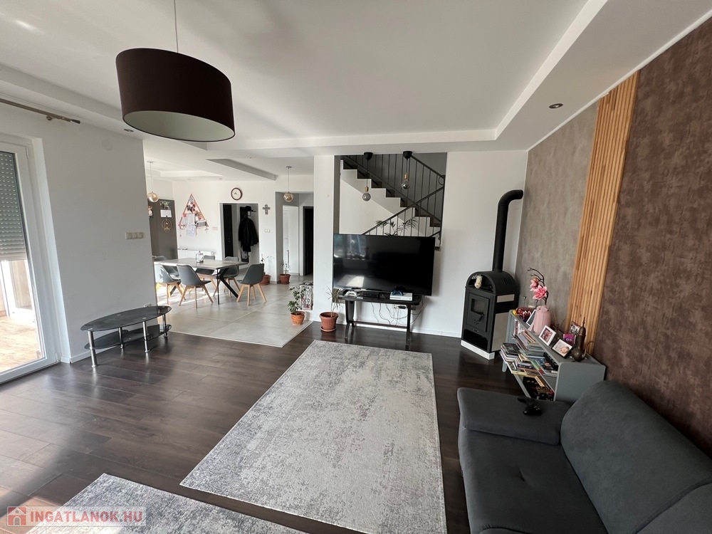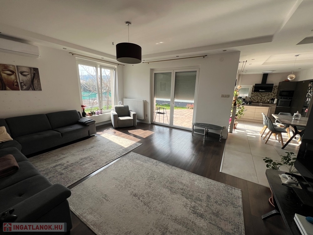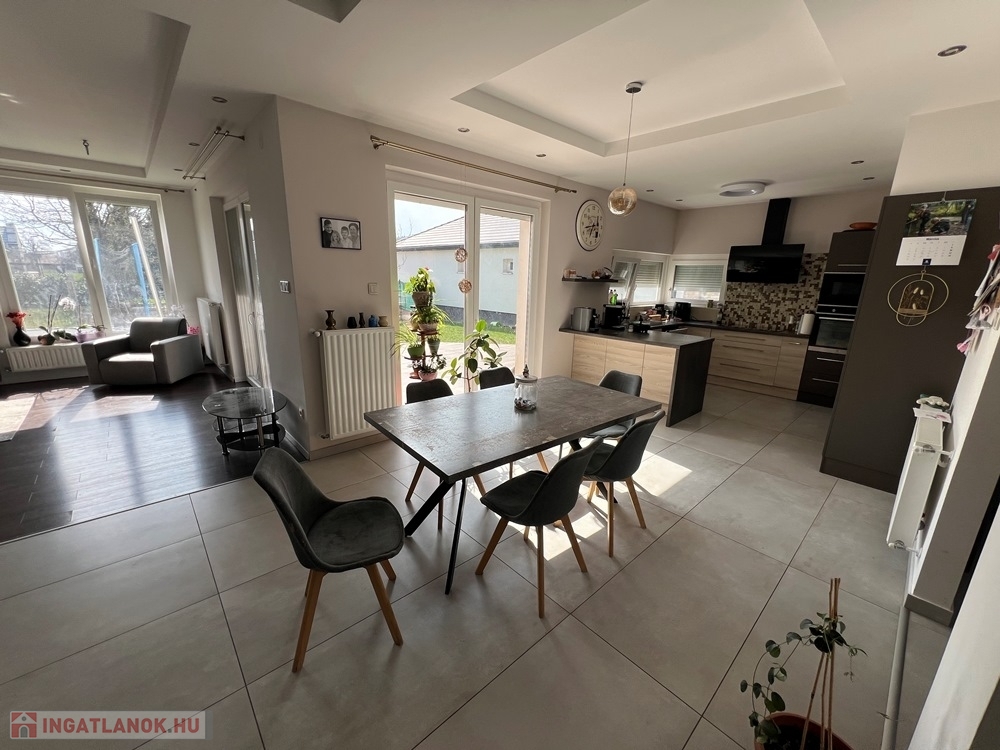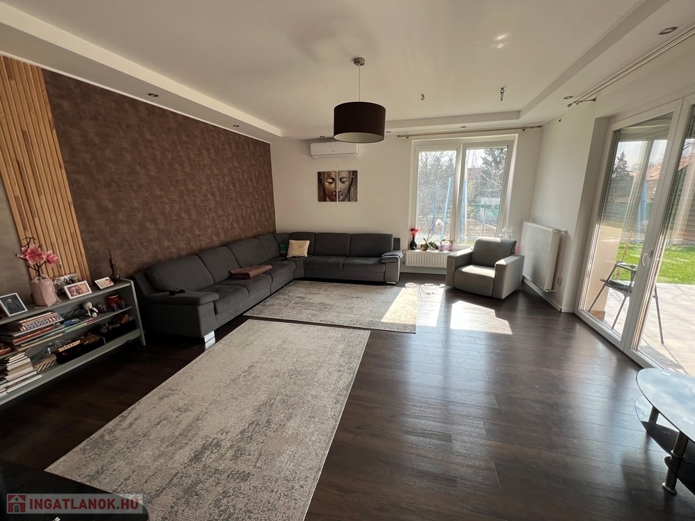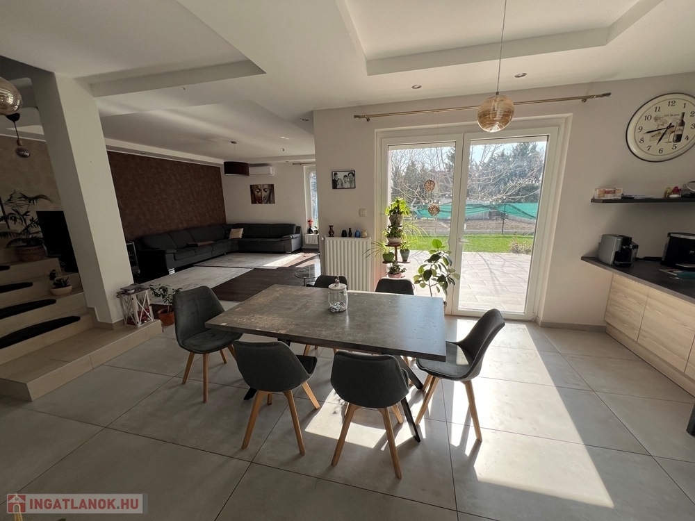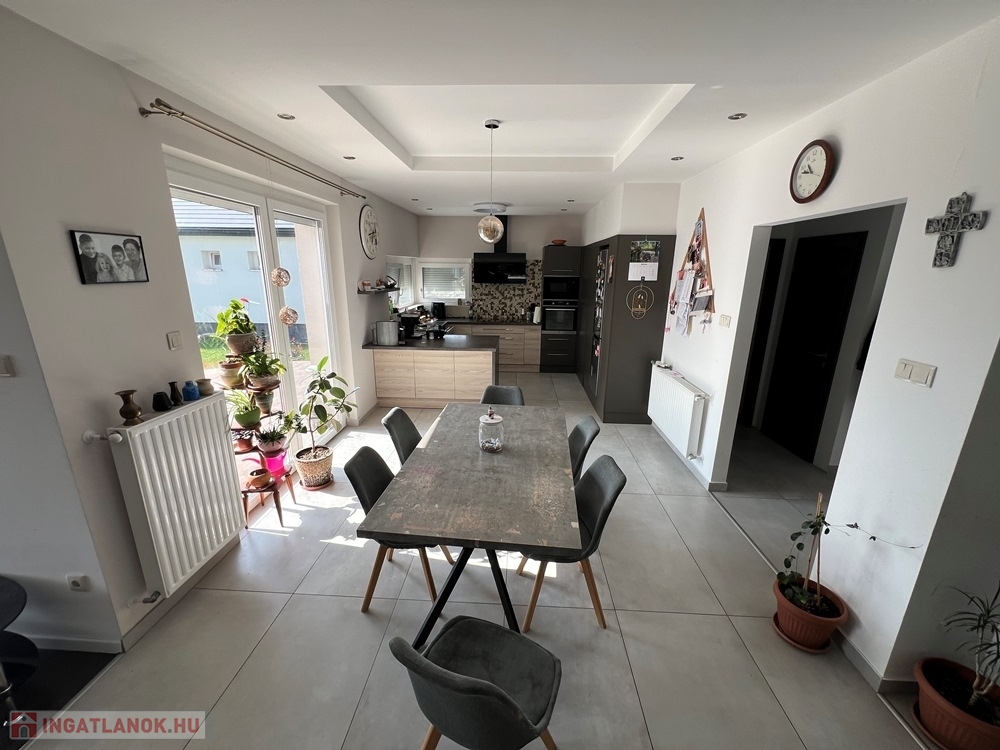 Győrújbarát kedvelt részén, 622 m2-es, összközműves, 29 M SZÉLES UTCAFRONTÚ telken lévő, amerikai konyha - étkező – nappali + 5 HÁLÓSZOBÁS, továbbá kamrával, háztartási helyiséggel, 2 db fürdőszoba - WC-vel felszerelt, KLIMATIZÁLT, 173 m2 hasznos alapterületű, kiváló állapotú, újszerű, duplakomfortos családi ház, 33,78 m2-es KÉT ÁLLÁSOS GARÁZZSAL, 25,05 m2-es TERASSZAL eladó.