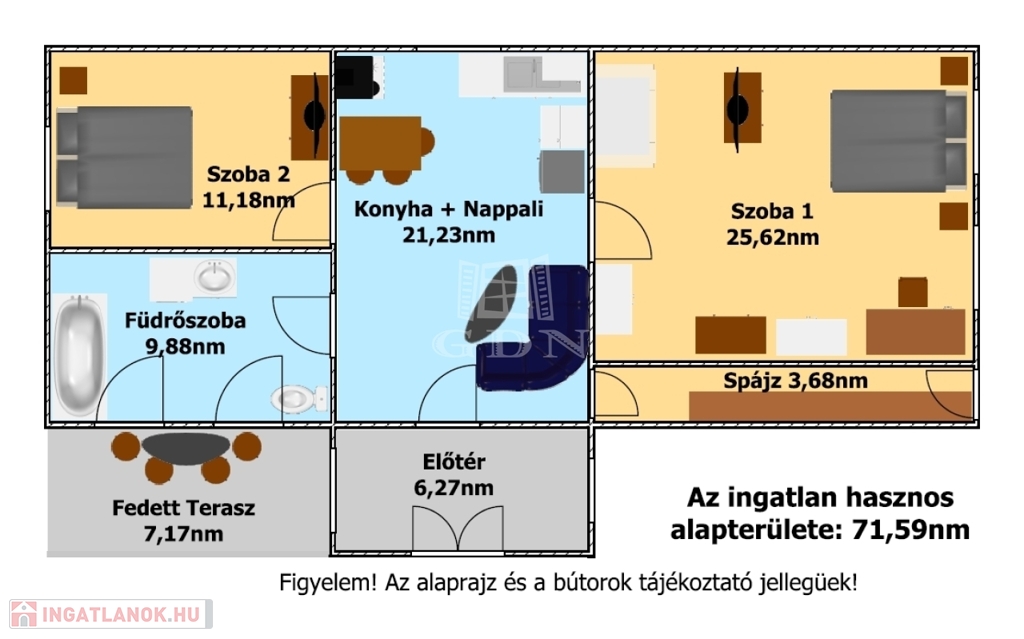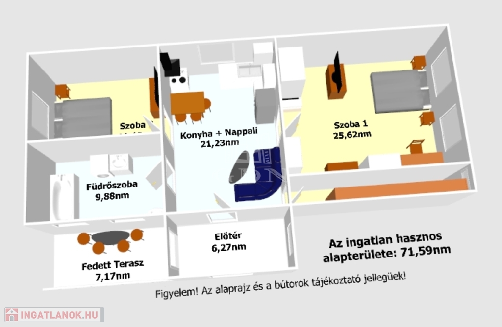 Az épület hasznos alapterülete 71,59nm melyben található: