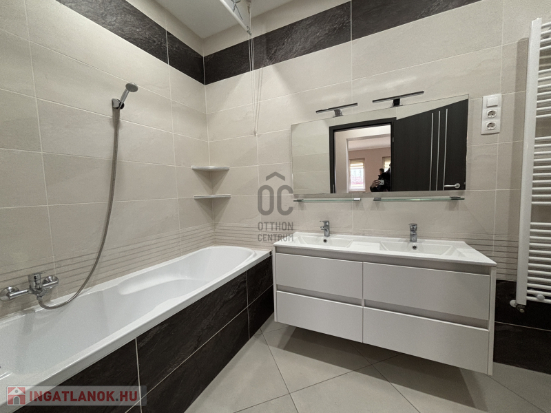 - Kád + zuhanyfüggöny, dupla mosdóval, törölközőszárítóval, WC-vel
