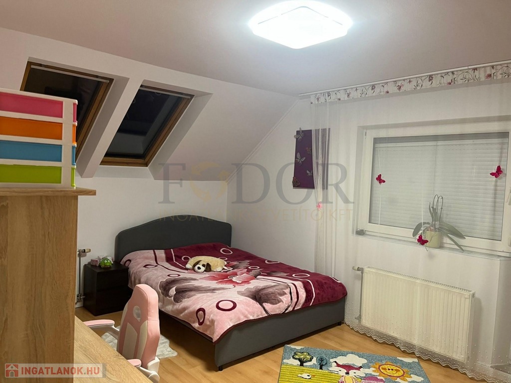 Az emeletre tömörfa lépcső vezet, ahol három hálószoba, egy gardróbszoba, két erkély (egy utcafronti és egy kertre néző), valamint egy nappali pihenősarok kapott helyet. Innen nyílik a beépített tetőtér, amely további szobák kialakítására is alkalmas, jelenleg tárolóként funkcionál.