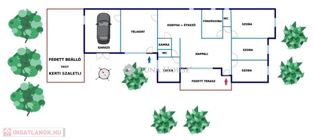 Helyiségek:tágas nappali, 4 külön nyíló szoba, térben szeparált konyha, kamra (spájz) nagyméretű, zuhanyzós fürdőszoba, 2 külön WC (egy kézmosóval a dolgozószoba mellett), télikert, fedett és nyitott terasz