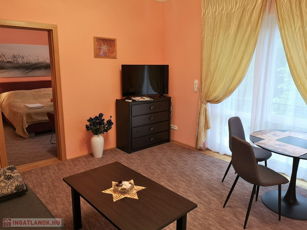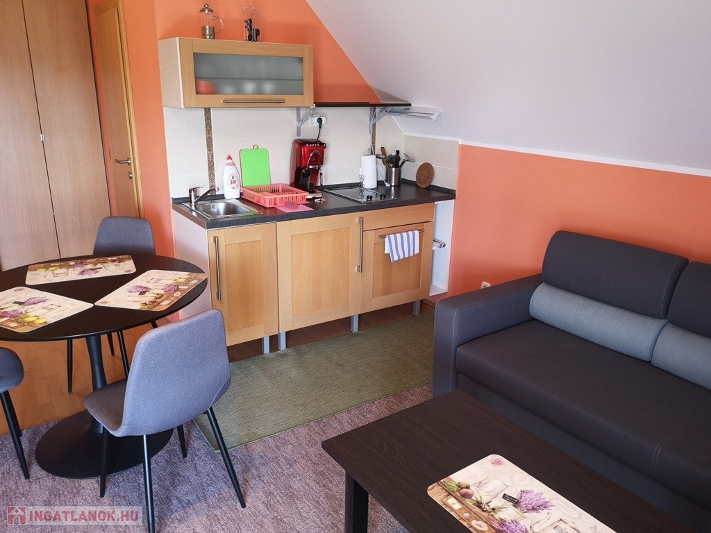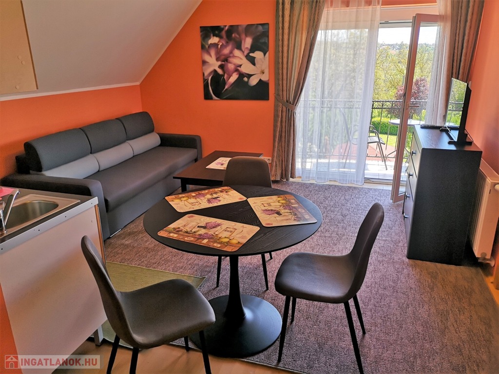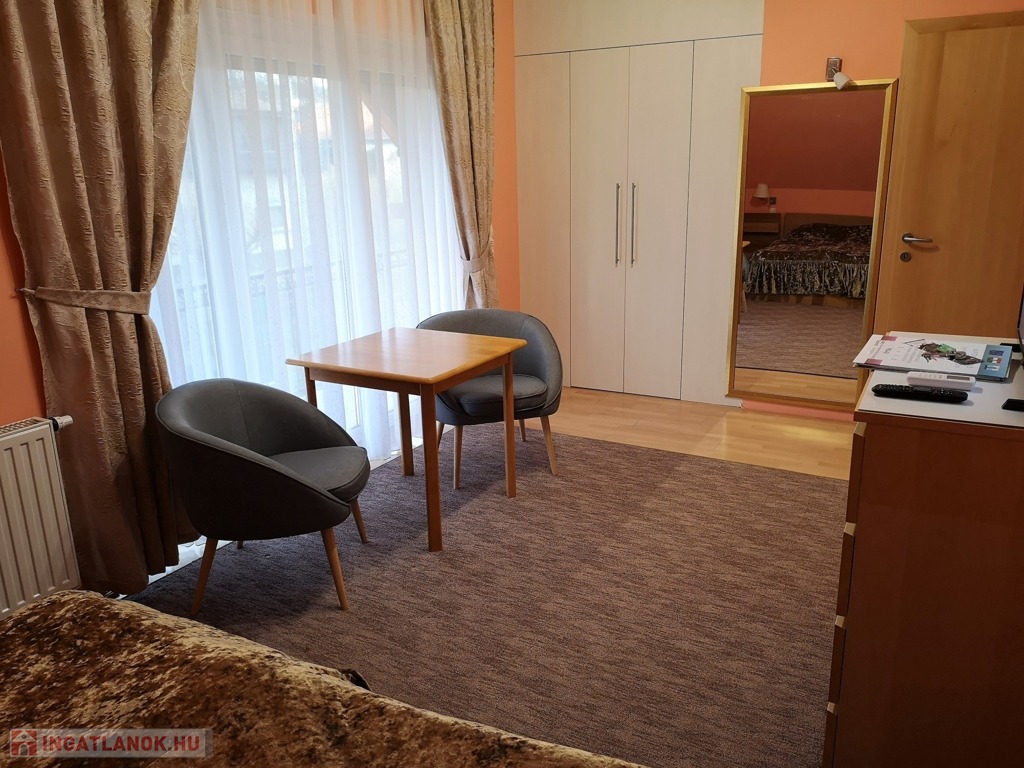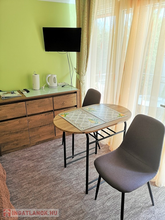 Zala vármegye, Hévíz 300m2-es, 3 szintes apartmanház eladó. A jelenleg is üzemelő, az ingatlan nyilvántartásban „kivett lakóház, udvar” megnevezésű ingatlan alsó szintjén konyha étkezővel, háztartási helyiség, tároló zuhanyzó illemhelyiséggel, külön illemhelyiség és szoba található. Átjárás az 50m2-es garázsba. A középső (fogadó szinten) a hallból jutunk a két apartmanba míg az emeleten további két stúdió és egy apartman került kialakításra. Az helyiségek teljesen felszereltek. Így összességében az ingatlanban 10fő (pótágyazással további 6 fő) elszállásolható. A ház 2000-ben épült, felújítása 2012-ben megtörtént (ekkor kapott 10cm szigetelést is). Azóta is folyamatosan karbantartott. A klímával, elektromos redőnyökkel felszerelt igényes ingatlan melegéről gáz-kazán gondoskodik. Legutóbbi fejlesztésként 2023-ban 8kW-os napelemes rendszer telepítésére került sor. A házhoz tartozó 879m2 telken gépjárműbeállók, a füvesített kertben grillező, pihenő és gyümölcsfák szolgálják a pihenők kikapcsolódását. Az ingatlan vételára teljes felszereléssel értendő. A ház alkalmas lehet bérbeadásra, de akár több generációs család lakhatására is