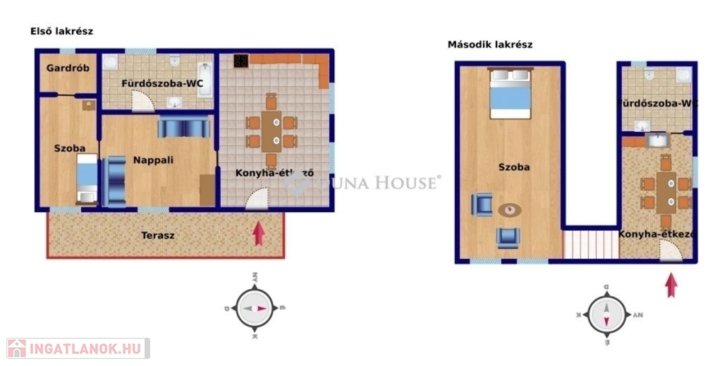 59 m²-es lakrész (felújítva 2019-ben): szinteltolásos kialakítással, tágas térérzettel rendelkezik. Található benne konyha-étkező, nappali, fürdőszoba káddal és zuhanykabinnal, hálószoba és gardrób – ideális kisgyermekes családnak vagy bérbeadásra.