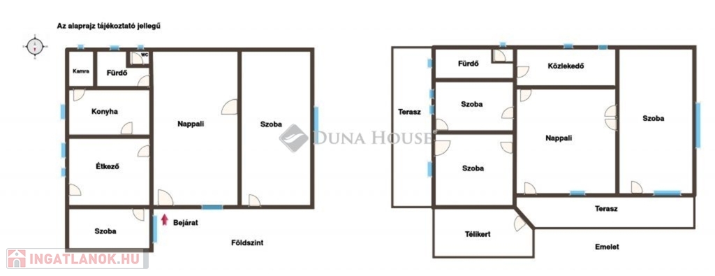2 szinten: nappali + 5 szoba + étkező + 2 fürdő + 2 WC + télikert + teraszok