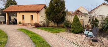 Az 1049 m²-es kert egy kész botanikus kert: gyönyörű növényzet, viacolor burkolat, automata öntözőrendszer (fúrt kútról).