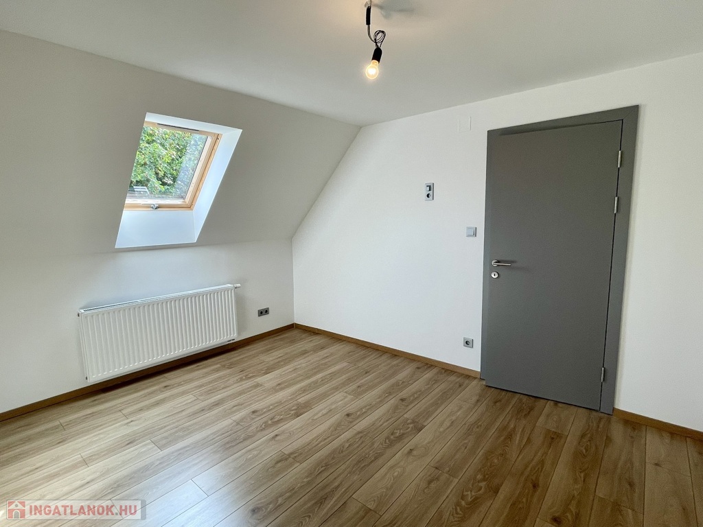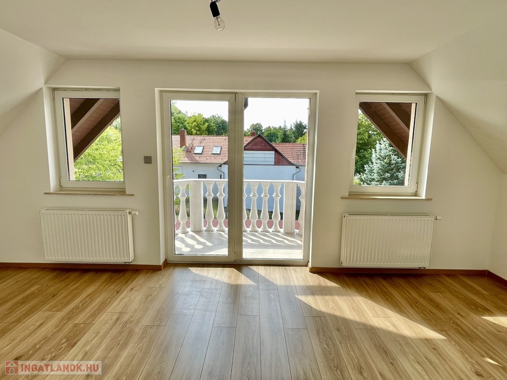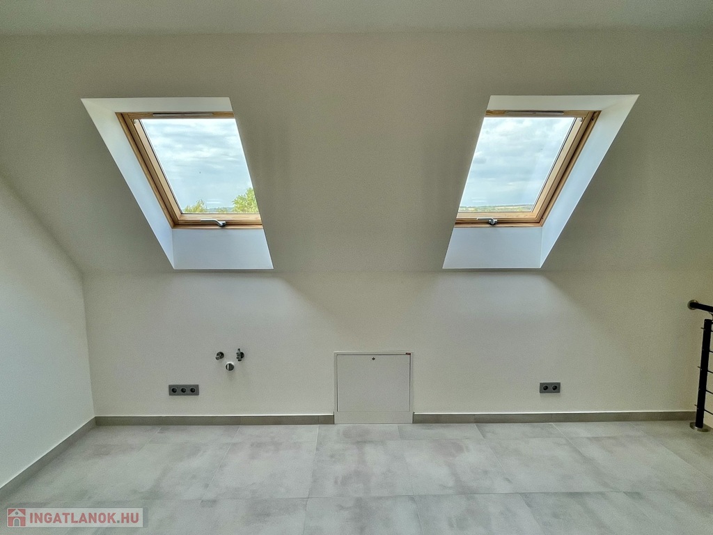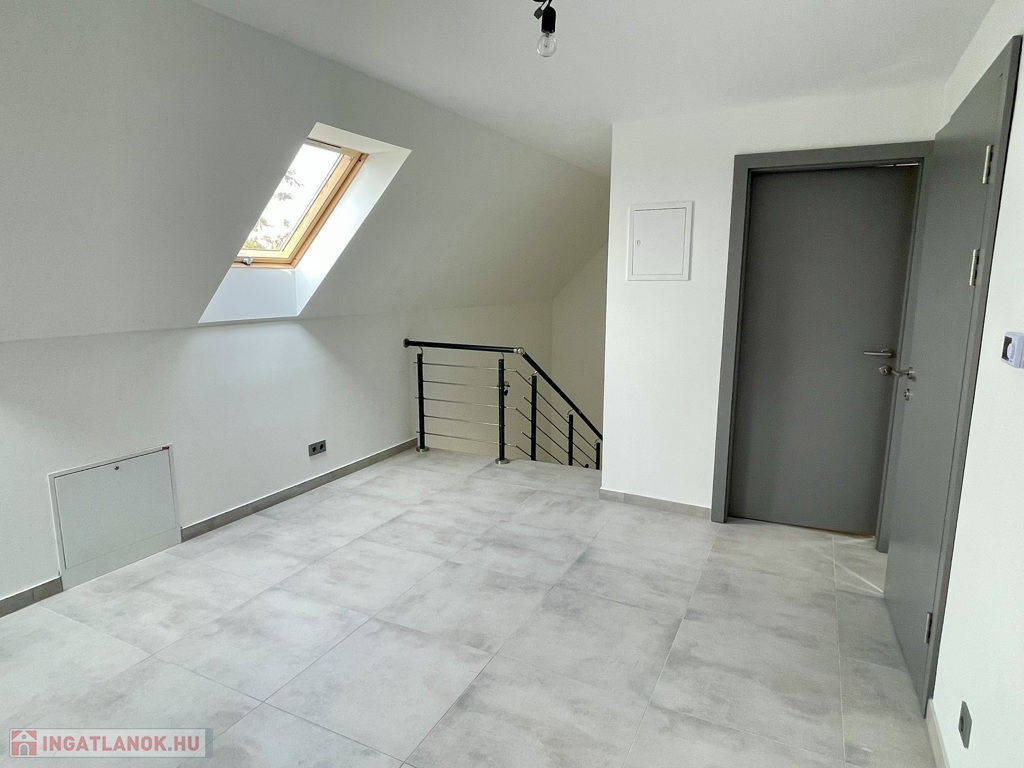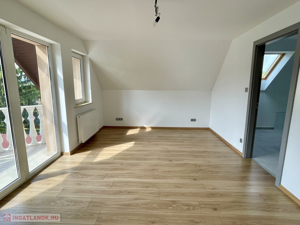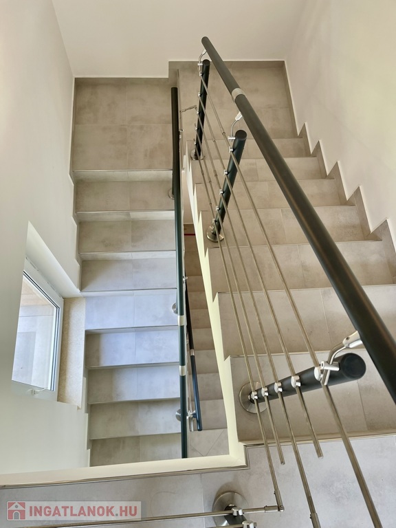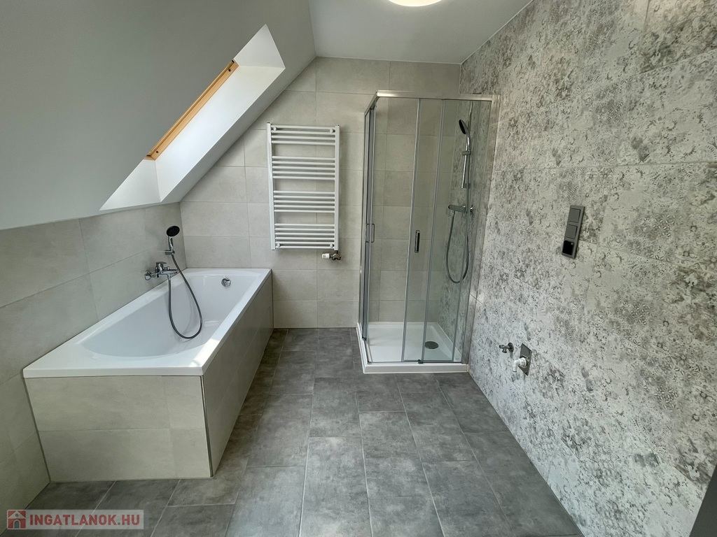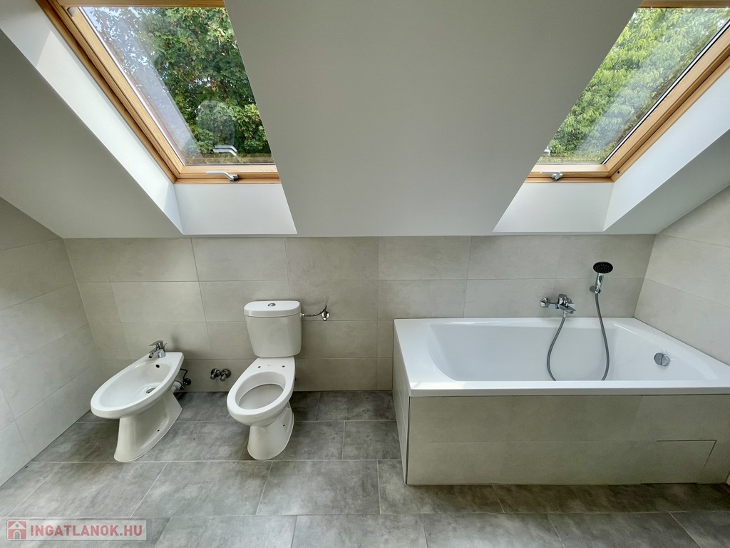 Felső szint: két hálószoba, nappali, fürdőszoba káddal, zuhanykabinnal és WC-vel, déli fekvésű erkély