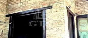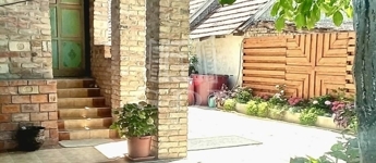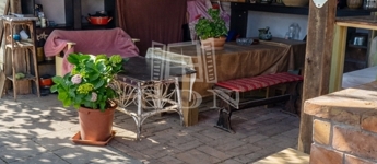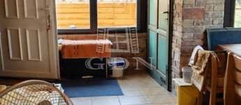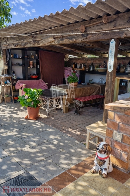 A házhoz kapcsolódik egy hangulatos, rusztikus stílusú, fedett terasz, amely egyedi elképzelések alapján, gondos kivitelezéssel készült.