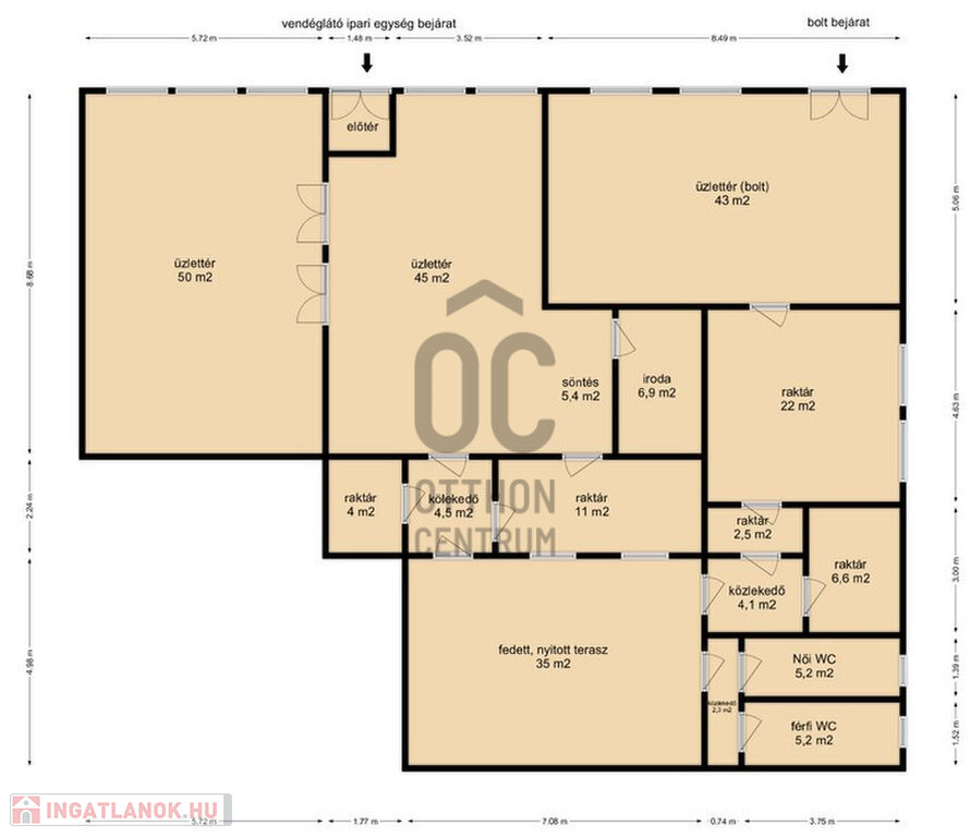 - 1209 m2- es telken helyezkedik el, a kettő HRSZ számon lévő ingatlan, mely egy 130 m2-es vendéglátó egységből és egy 81 m2-es boltból áll.
