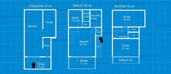 Felső szint: két hálószoba, zuhanyzós fürdő, WC, két erkély.