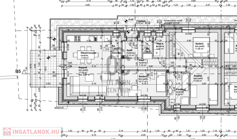 - hálószobák, nappalik laminált parkettával, a többi helyiségek járólappal burkolt lesz