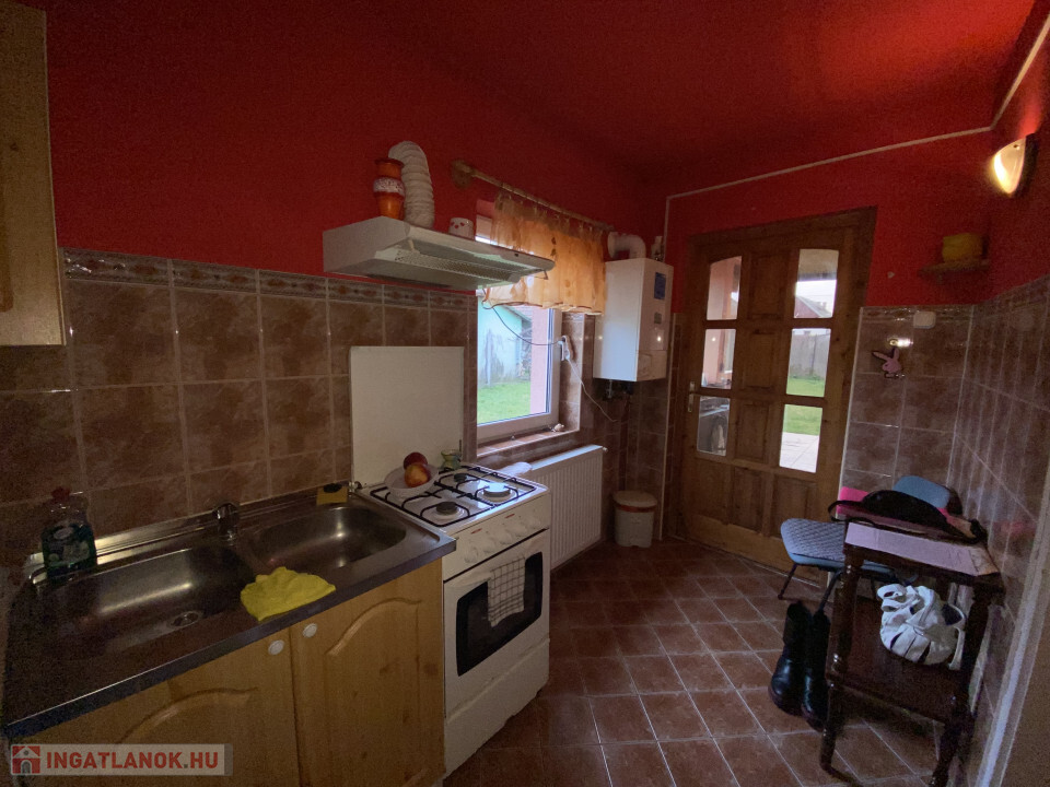 A ház 3 szoba, konyha, fürdő elrendezésű, cirkó fűtéssel, karbantartható méretű, füvesített telekkel.